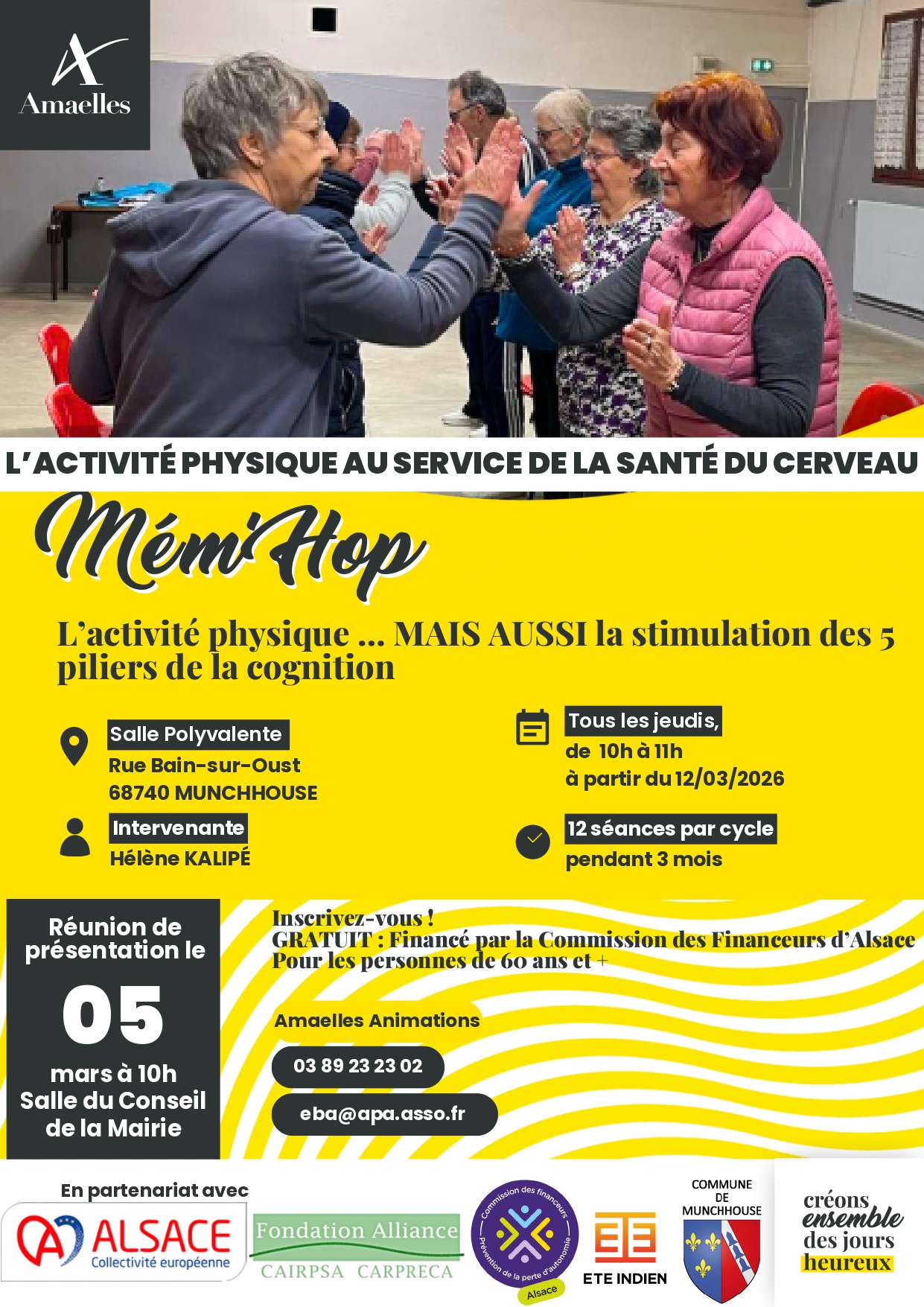 Mém’Hop est un programme innovant qui associe activité physique douce et stimulation cognitive, en travaillant les 5 piliers de la cognition (mémoire, attention, langage, raisonnement, fonctions exécutives), le tout dans une ambiance conviviale et adaptée aux capacités de chacun.
